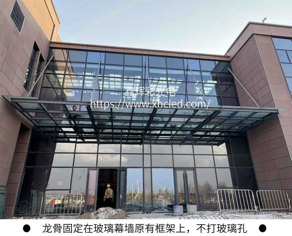 ?????? 2.解決方案:本項目為玻璃幕墻 / 玻璃櫥窗專用高清顯示方案,采用P3.9×7.8 高通透 LED 格柵屏,專用鋁合金夾具固定,前維護設計,模組可單獨拆卸,高空 / 玻璃場景更安全。