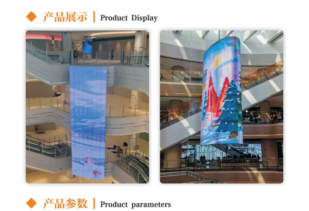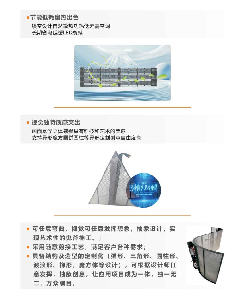 • 顯示效果:高灰低階顯示技術,色彩鮮艷飽滿、還原度高;播放流水瀑布、立體三維視頻時效果極佳,營造深度沉浸感,吸引觀眾高度關注;背景通透的特性讓廣告畫面呈現立體三維效果,增強展示感染力。