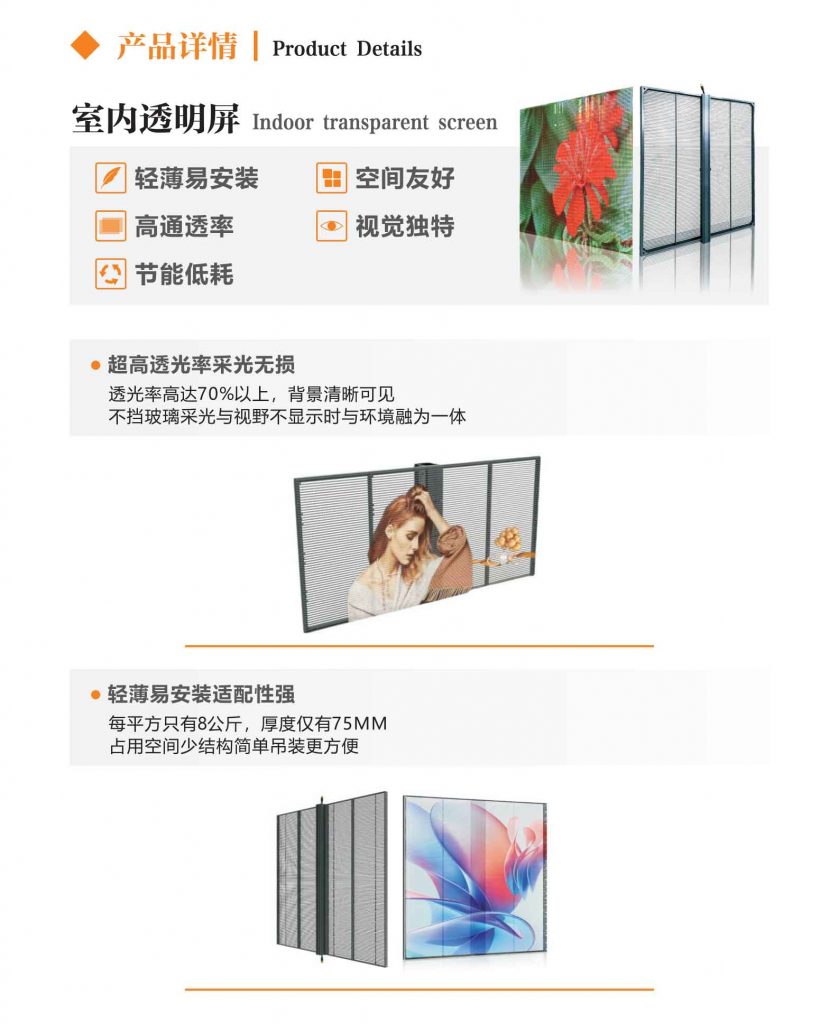 • 產品概述:LED 透明屏分為戶外與室內兩大系列,是一款兼具顯示效果與空間通透性的創新產品,適用于商業綜合體、商場櫥窗、中央電梯、大廈幕墻、酒店廣告等場景。戶外透明屏采用自主研發開模設計的塑料套件(原料 + PC),一體成型結構保障防水性能。