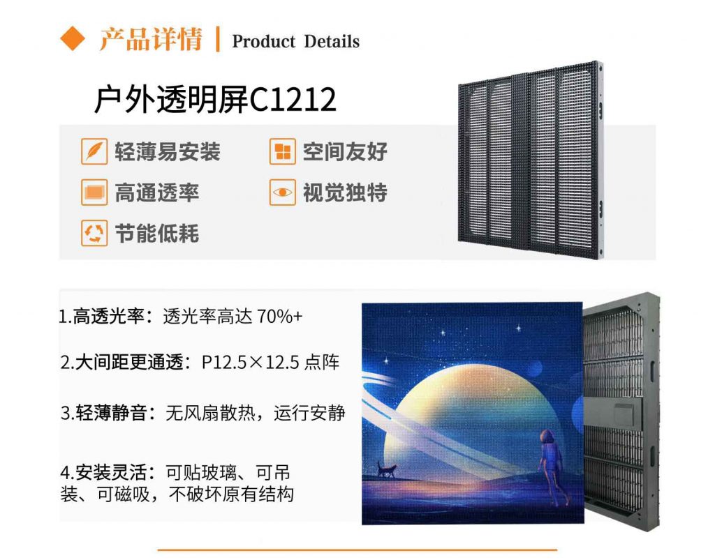 顯示效果:高灰低階顯示技術,色彩鮮艷飽滿、還原度高;播放流水瀑布、立體三維視頻時效果極佳,營造深度沉浸感,吸引觀眾高度關注;背景通透的特性讓廣告畫面呈現立體三維效果,增強展示感染力。